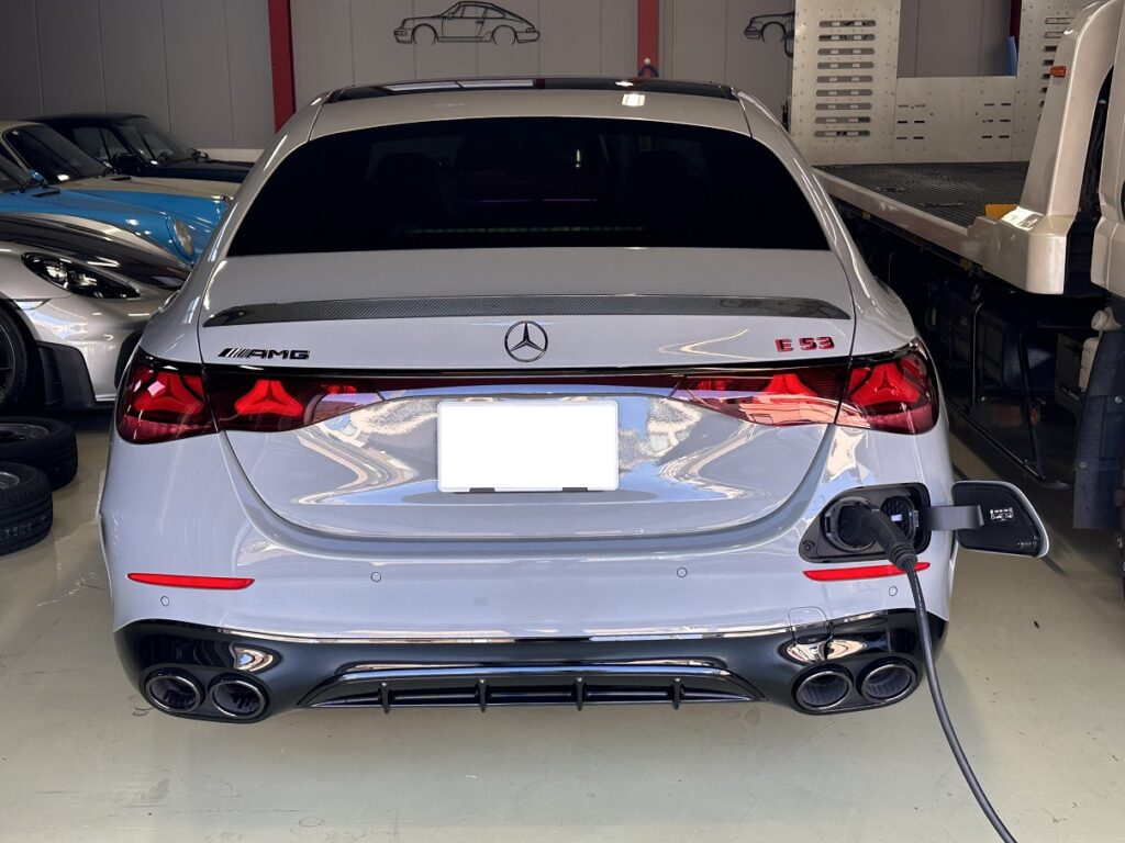 このE53は プラグインハイブリッド なのですが、ちょうどうちでタイカン用に設置した充電器がそのまま使えましたので、満充電にしてから納車させていただきました。