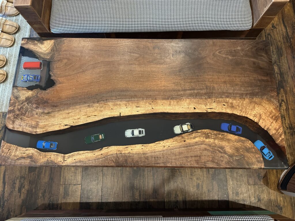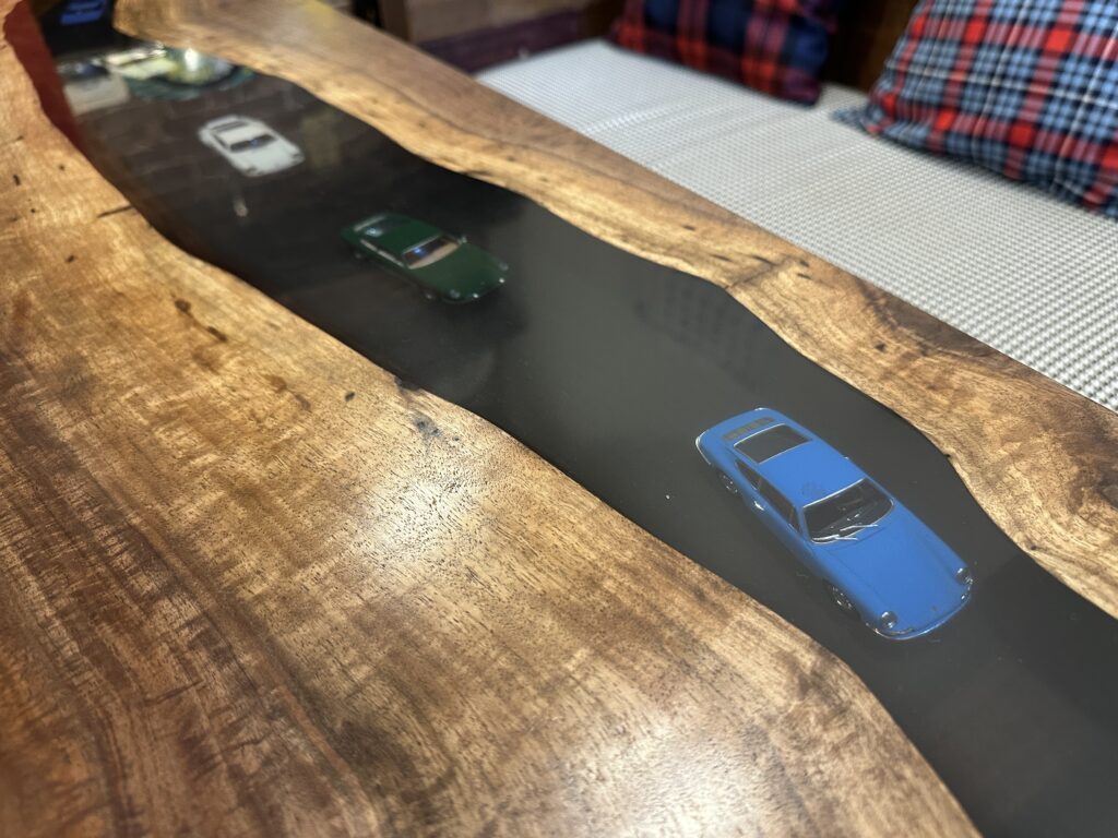 木の表情を活かしつつ、レジンの中にはポルシェが峠をツーリングしている情景を落とし込んで頂きました。