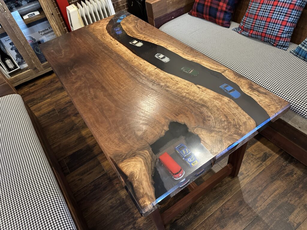 ↓こちらが今回の目玉でもある、1枚もののウォールナットから製作して頂いたレジンテーブルです。